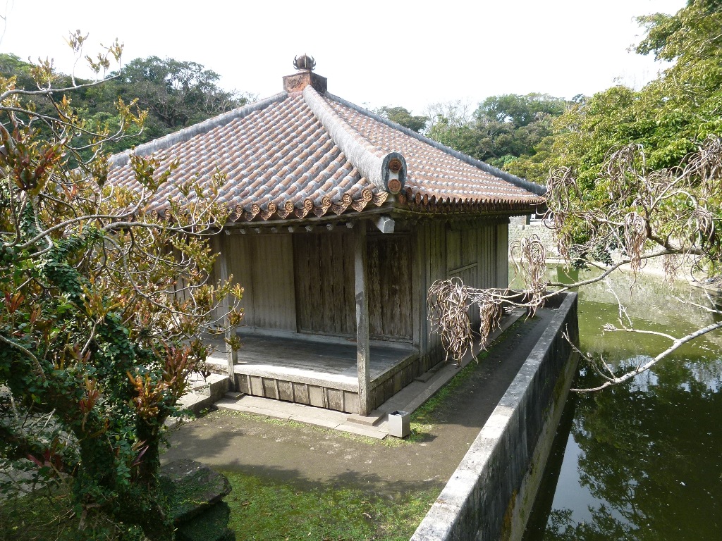 首里城公園にある円鑑池(えんかんち)があります。この池にも様々な形をした石灰岩が積まれ、中島にはお堂があります。沖縄独特の赤瓦です。このお堂のなかには弁財天が祀られています。ここでも記念写真を収めました。