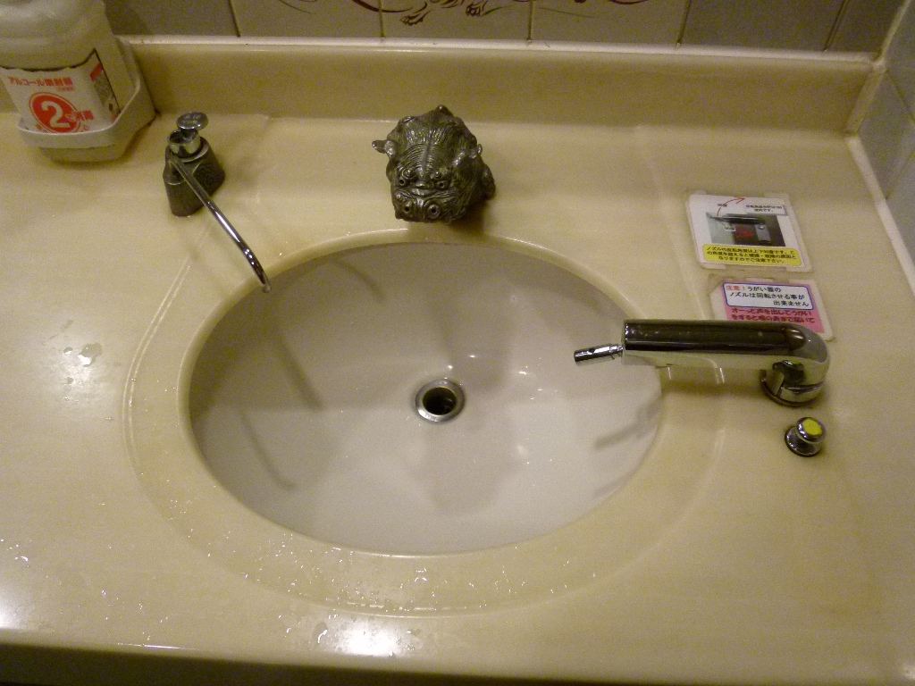 正殿見学した後は北殿。ここには自販機もあって飲みもの購入してちょっと休憩を取れます。ここではミニシアターもあって首里城の歴史に触れながら説明も伺え楽しめました。またショップではおみやげ品の買い物もできます。ちょっと驚いたのはトイレに入ると手洗い所の蛇口はシーサーちゃん。びっくり、思わず笑ってしまいました。