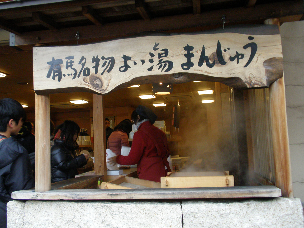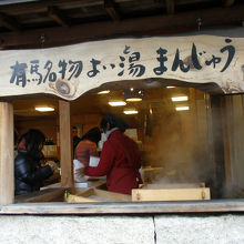 有馬温泉の人通りが多い、観光スポットにあるお土産が買えるお店。炭酸煎餅のほかにも、ショーケースの中、上にも複数の美味しそうなお菓子が並んでいます。