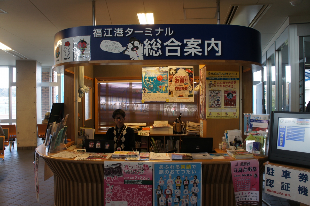 福江港ターミナルには、一階に五島市観光案内所のブースがあります。福江島は、上五島と違って、教会群だけでなく、遣唐使や倭寇に、石田城・武家屋敷ほか福江藩や仏教関係の見どころなど、かなり多彩です。予備知識はあったつもりだったのですが、やはりここで少し頭の整理をした方がいいと思います。資料類もけっこう充実しています。