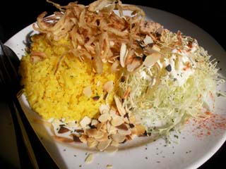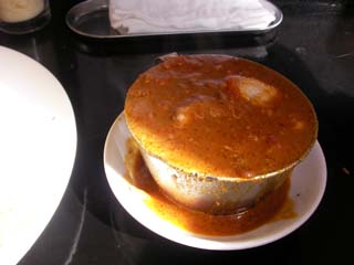 入店順にカレーが出され、10分ほどで順番が来て10種類あるトッピングから3種類を聞かれ、5番のスライスアーモンド、7番のツナマヨ、10番のフライドオニオンを5,7,10の番号で注文すると、カップに入ったカレーと、ターメリックライスにトッピングが乗った赤い鶏カレーがカウンターに載せられて、自分でテーブルに降ろして食べ始めます。