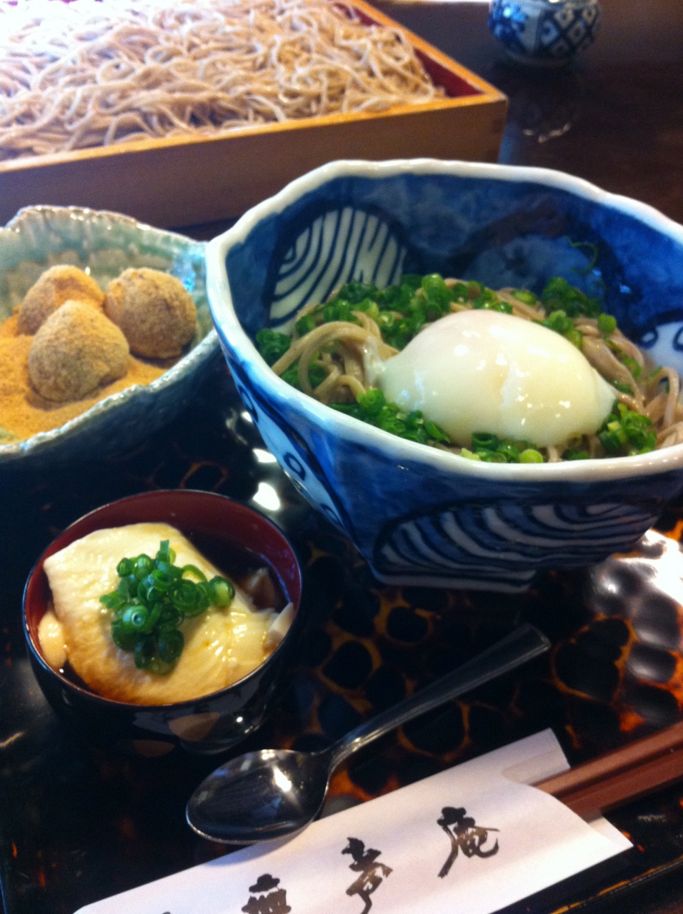 福岡より向かうと一番端っこのお蕎麦屋さんでしょうか。少し奥まっているので注意して看板を探さないと通り過ぎます。いつも頼むのは床並そば(\1800)。温泉卵の乗ったぶっかけそばとお豆腐、鴨のたたきと白玉団子がついてきます。蕎麦茶を飲みながら、ぼーっとお蕎麦を待つ時間も大好き。またパワーチャージに行かねばー