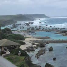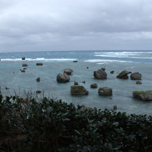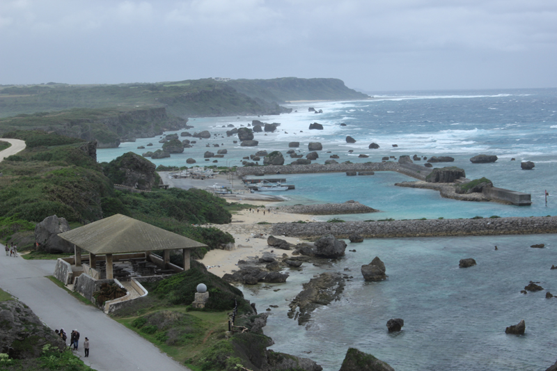 宮古島の東に向かって進むと、最後は道路が行き止りになりその手前に駐車場があります。時間帯によっては観光バスもやってくるようです。岬の先には灯台があり、有料ですが登ることができます。下でも風は強かったのですが、灯台の上はさらに風が強く吹き飛ばされそうでした。上からは、灯台の直下の風景を眺めことができますが、岬が細長く伸びているのがわかります。北側の海の浅瀬には、大きな岩がごろごろとたくさん頭を出していて、なかなか奇妙な風景です。また、駐車場まで、灯台の下から細い遊歩道があって南国の植物の間を歩いていくことができます。
