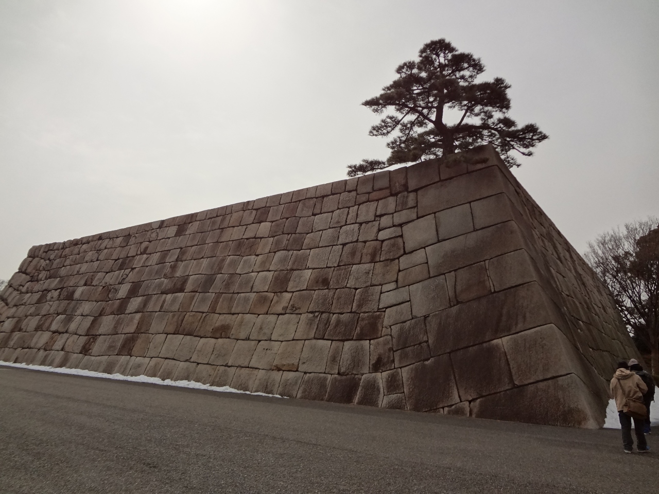 北の丸公園や靖国神社の近く、北桔梗門から皇居東御苑内に入ると、巨大な石積みが目の前に現れます。これが、江戸城の天守閣の基礎石であった石垣です。現在は高さ10mほど有り、上まで登れるように整備されています。天守閣は、地上からの高さは58mあり、基礎石積みは、44メートル四方も有り、その上に五層のの天守台がそびえていたそうです。