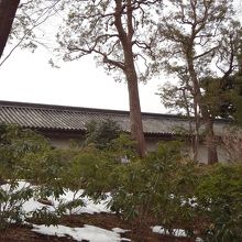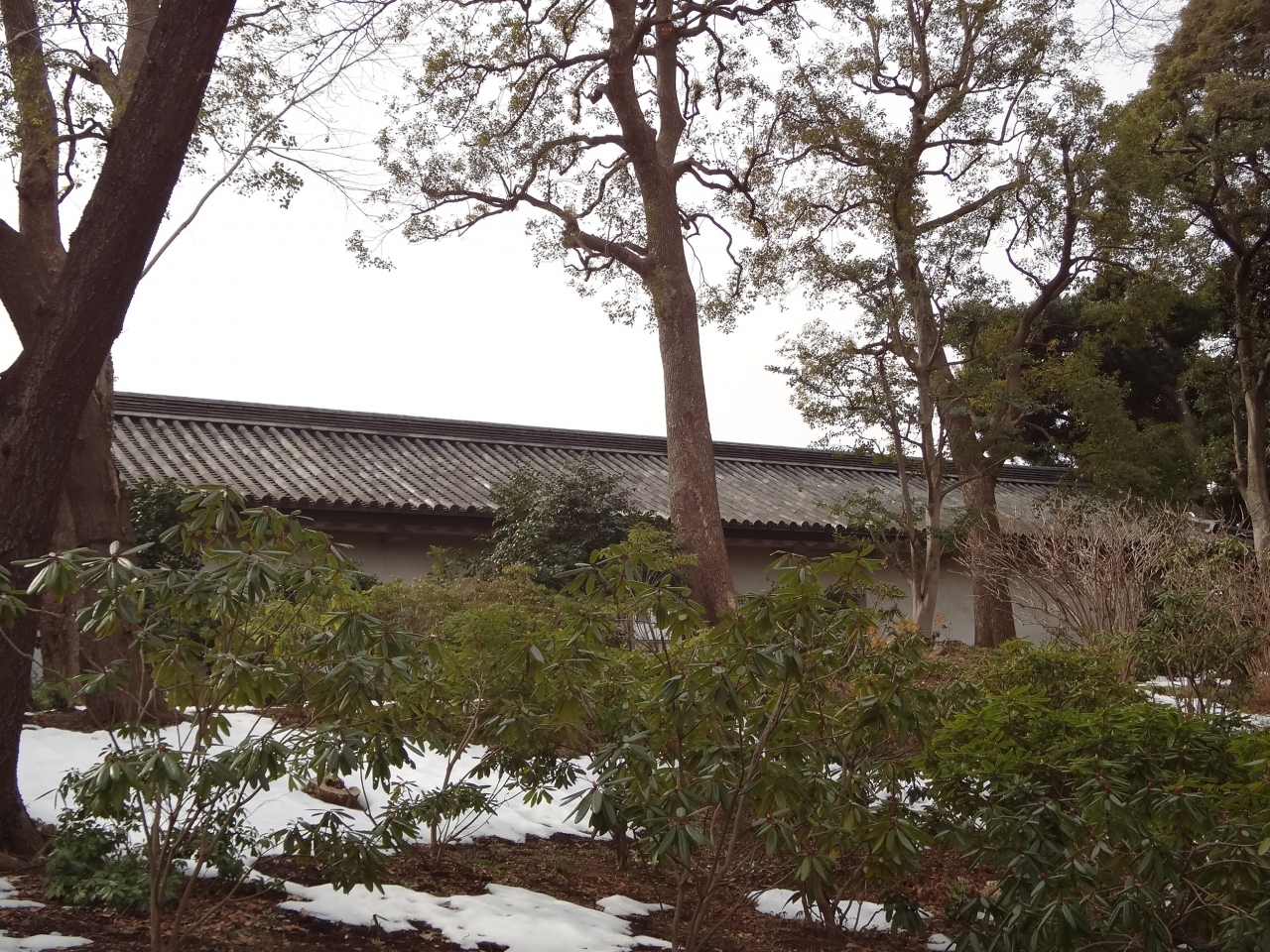 本丸跡の広場の西側、小高くなった堀の土手の上に、幅の長い建物が建てられています。これが、富士見多聞です。多聞というのは、防御をかねて石垣の上に設けられた長屋造りの倉庫のことだそうです。敵が攻めてきたら外側に向いている格子窓を開けて、鉄砲や弓で狙い打つことができるようになっているそうです。先日の大雪の影響で、さらに近づける階段は閉鎖されていましたが、下からでもよく見ることができます。