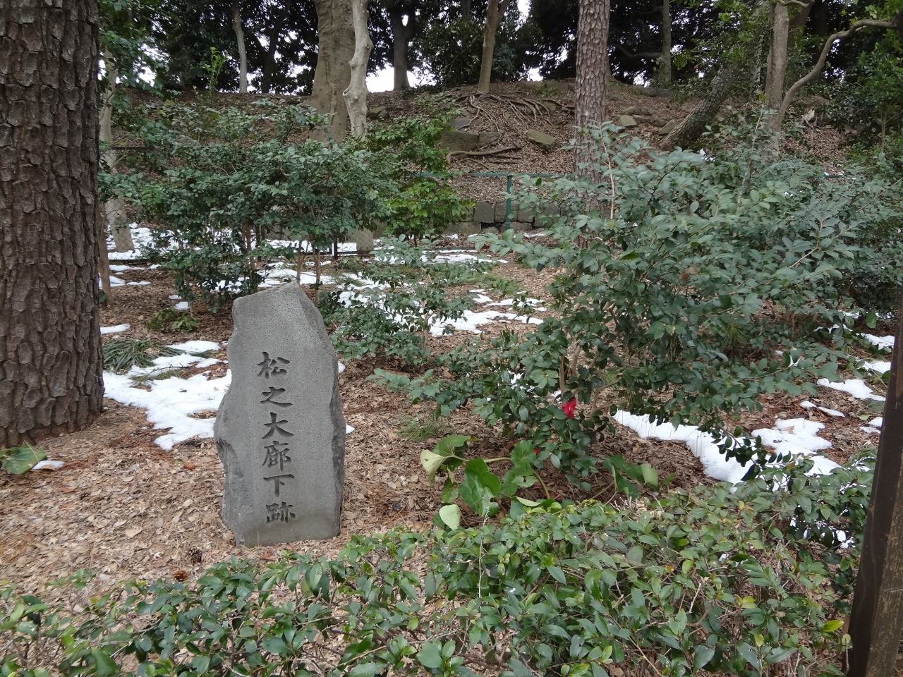 富士見多聞と富士見櫓の真ん中辺り、植え込みの中に碑が建てられています。江戸城で2番目に長い廊下っだそうです。廊下というと、板敷のイメージがありますが、畳敷きの立派なものだったそうで、廊下に沿った襖戸に「松」と「千鳥」を主題にした絵が描かれていたことから松の大廊下と呼ばれていたそうです。