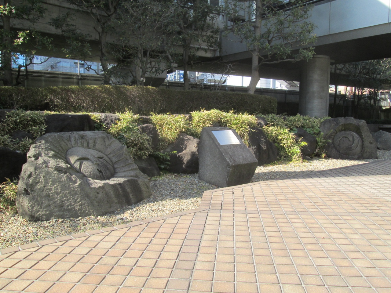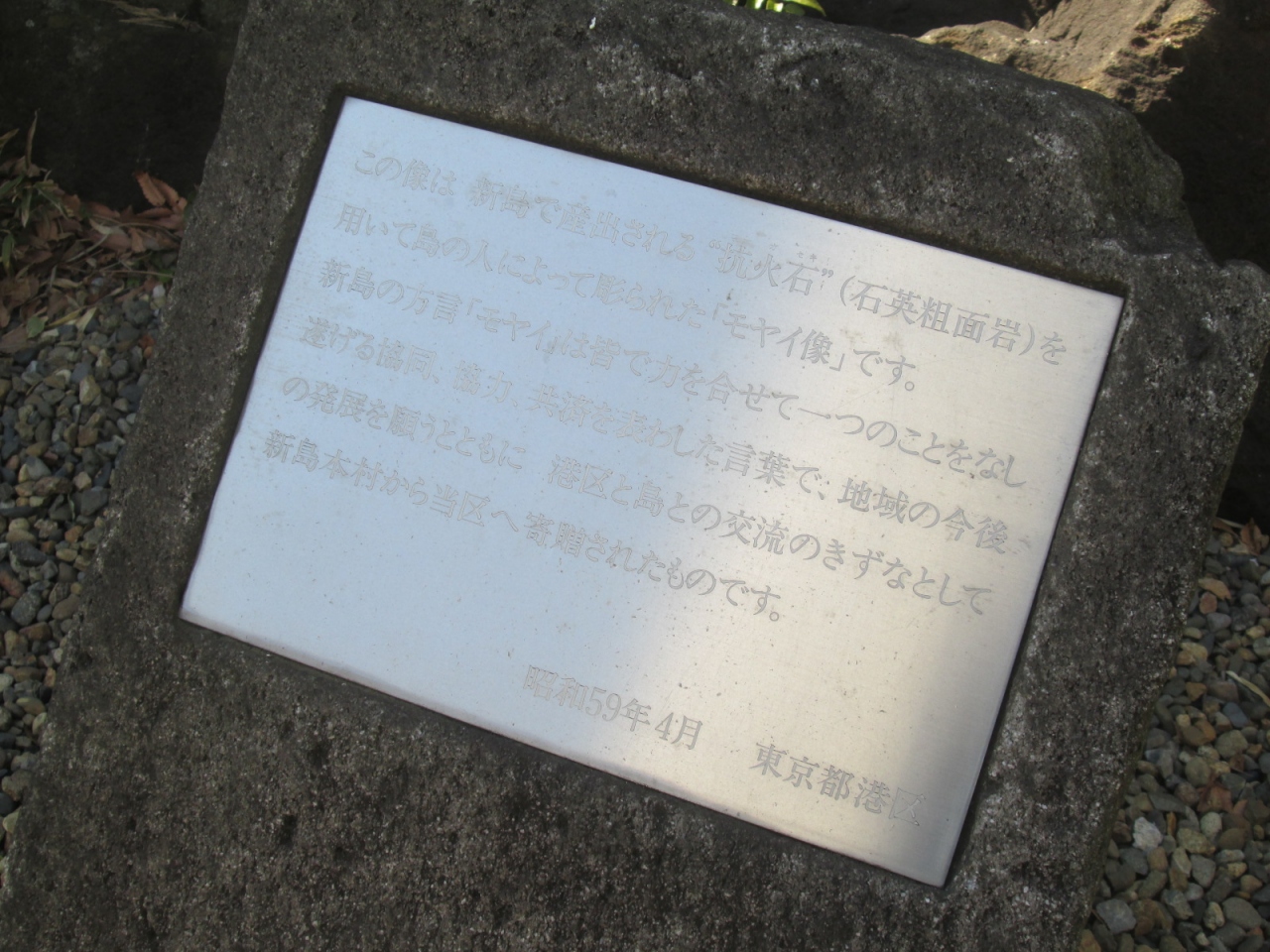 港区、それも「浜松町」や「竹芝」駅周辺には、「竹芝通り」に代表されるように、伊豆諸島や小笠原諸島に因むものが多いと思います。やはり近くの「竹芝客船ターミナル」によって島々と結ばれているからなのでしょう。新島から港区に贈られたこの「モヤイ像」も、港区と島々を結ぶ絆をあらわす記念碑的なものなのでしょう。像を紹介したパネルには、この像が新島産の抗火石(石英粗面岩)を用い、島の人々によって彫られたものであること、そして、”モヤイ”という言葉が新島の方言で”皆で一つのことをなし遂げる共同、協力、共済を表わした言葉”と記されていました。ちなみに、イースター島の”モアイ像”とは別物ですが、”モアイ像”をモデルにしたものということです。しかし、何故こんな目立たない場所に設置されたのか…そちらの方が気になりました。