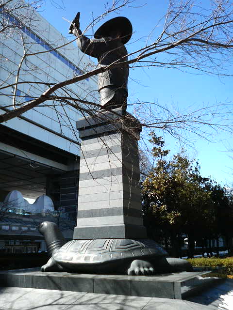 細長い台座の上に立つ鷹狩り中の御姿のようで、戦の最中のような鎧武者姿が多い他の戦国武将の像と違い、どこか平和な感じというか、天下泰平というイメージです。