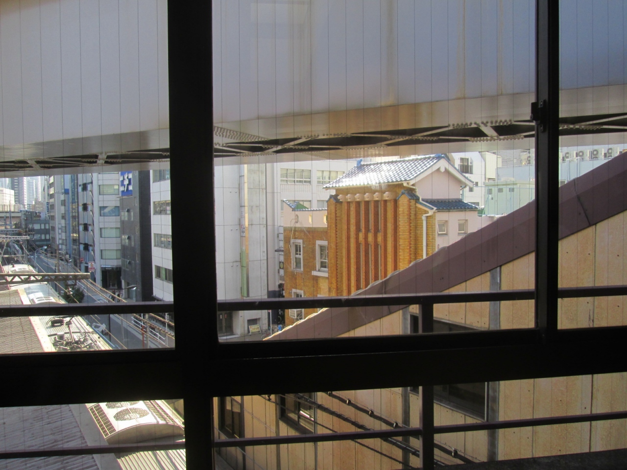 「浜松町」駅S5出口の目の前にあります。昭和6年の建物ということですから、もう83歳になるんですね。空襲・再開発を生き延びたビルが、まだ現役で使われているというだけでも貴重な存在だと思います。さて建物は、壁面にスクラッチタイルが貼られ、窓ガラスの一部にはステンドグラスがはめ込まれた昭和初期の洋風モダン建築ですが、天井部分の一部は瓦葺き。九段会館(旧軍人会館)などと同じく、明治初期に発生した疑似洋館の系統を引くような趣で、なかなか渋いですね。