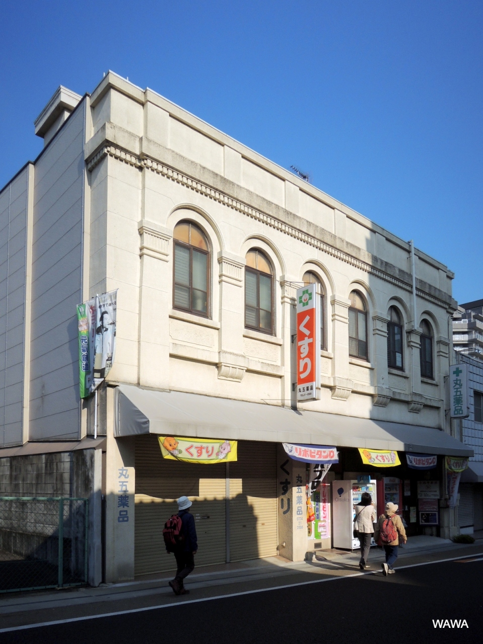 JR宇治駅前から平等院にかけて続く宇治橋通り商店街にある丸五薬局は、昭和初期の近代建築です。初めて見たときには看板建築かと思ったのですが、解説板によると当時としては珍しいコンクリート建築とのことでした。建築当時は丸五百貨店として使われたとのことで七本アーチのモダンな外観がとても印象的でした。
