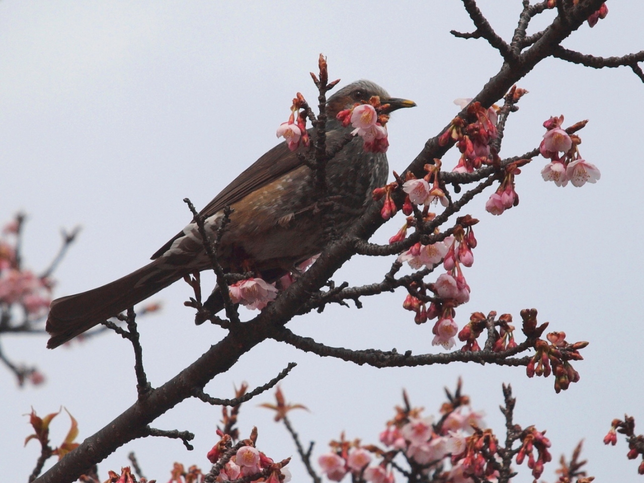 更に上へ登って行くと、あちらこちらに椿が咲いており、カワヅザクラやカンザクラなども咲き出していて、枝や芝生で小鳥が遊ぶ姿も見られました。
