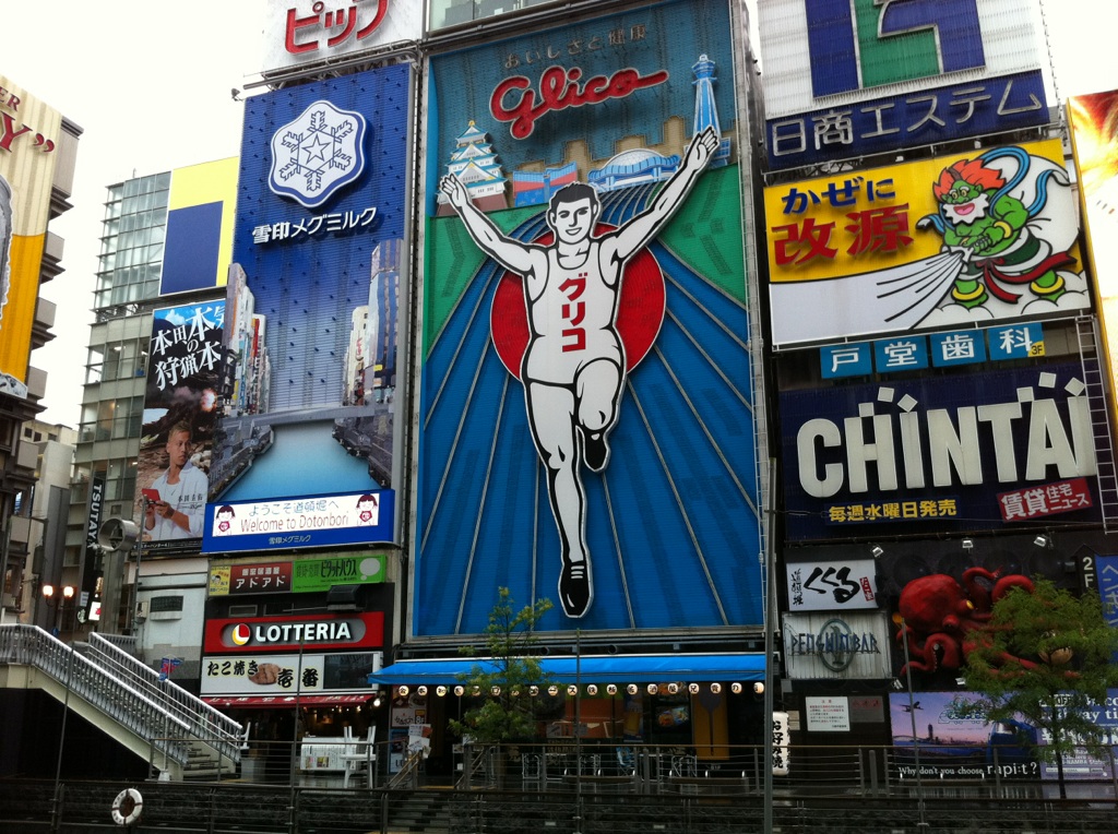 大阪名物の一つがここです。ギラギラとひかるネオンの中に両手を上げて走る人の姿。日本を代表する御菓子メーカーグリコの看板があります。近くによるとその大きさに圧倒されてしまうほどのインパクトがありますね。