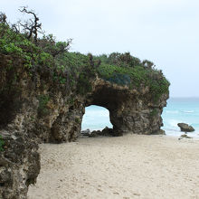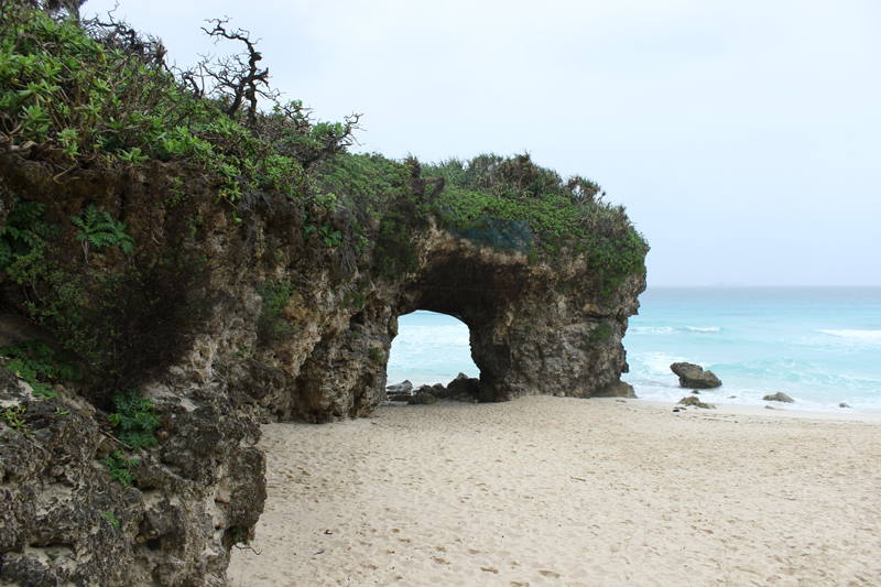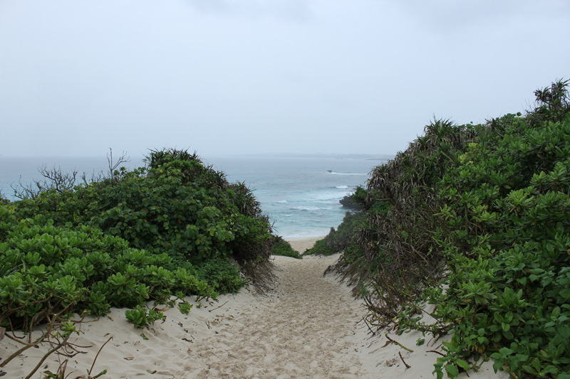 雨と強風の中をいきました。駐車場の所から、白砂の道が続いています。小高い丘を越えていきますが、道は白砂だけしかありません。ビーチは、狭いですね。左側に洞がありましたが、崩落の恐れがあるのか網がかかっていました。