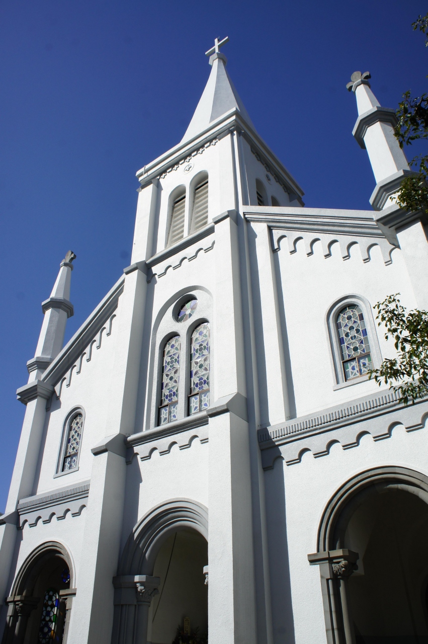 中町教会は、桜町電停からほど近い山側に建つカトリック長崎教区の教会。明治時代、フランス人女性からの寄付を受け大村藩の蔵屋敷跡に建築されたそうです。大きな建物で白い外観がとても清々しい印象。