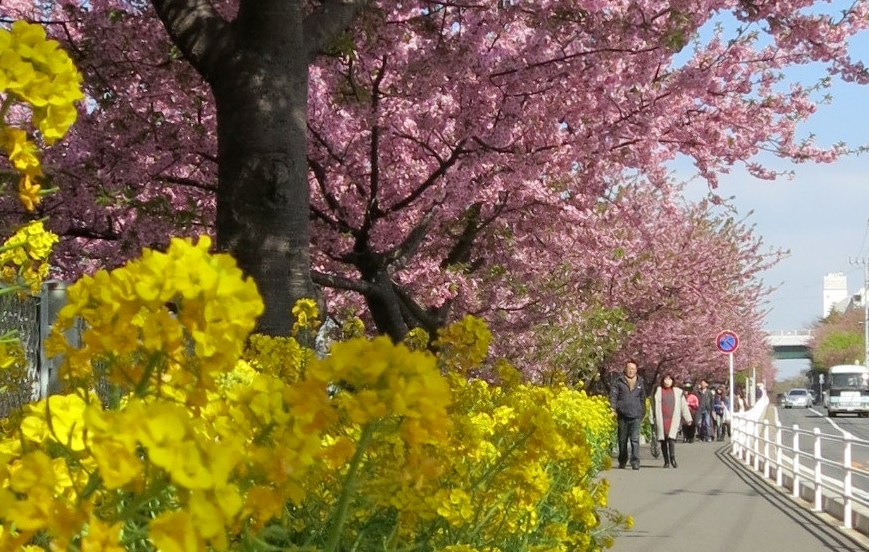 桜の下には黄色の菜の花も咲き、時々通過する赤い京急の電車との