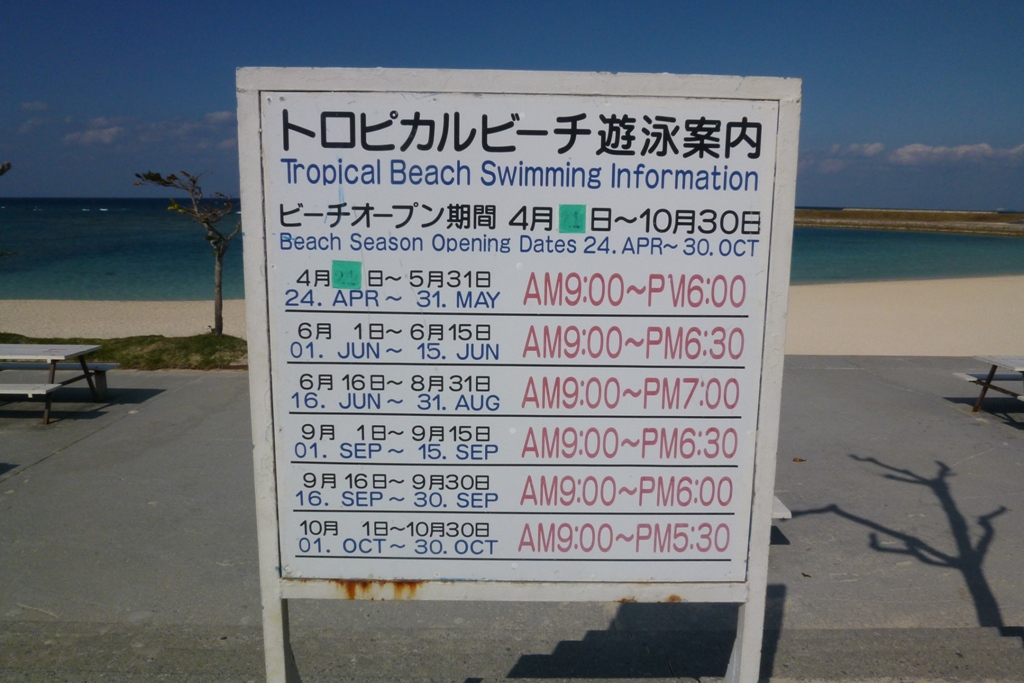 宜野湾(ぎのわん)にある海浜公園にあるトロピカルビーチは人工の砂浜海岸です。ここは禁止区域などもありますが、のんびり海を眺めるのも良いものですね。沖縄の遊泳期間は長く4月下旬から10月末まで楽しめるようです。
