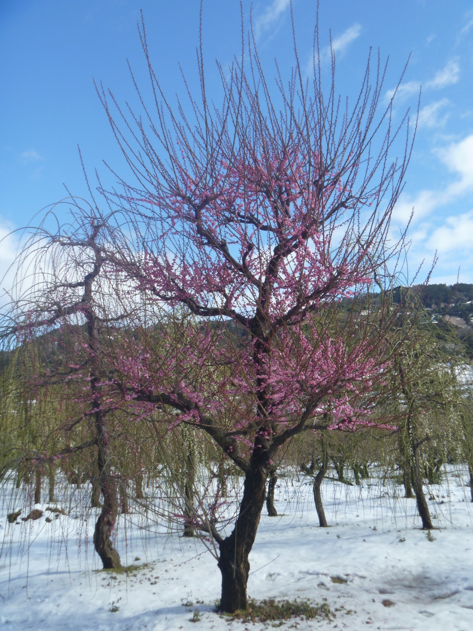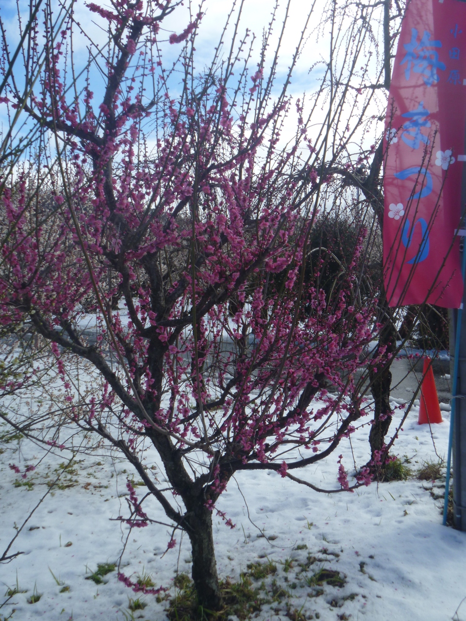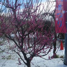 寒さで開花が遅れているようで、まだ見頃ではありませんでしたが、青空の青と雪の白、梅の赤のバランスが素敵でした。