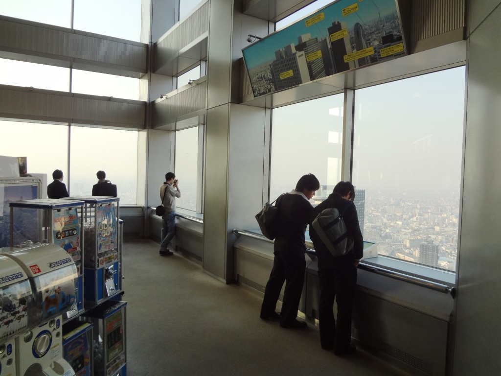 巨大な威容を誇る東京都庁の展望室に初めて訪れました。北と南、2つの展望室があり、今回は北展望室に上りました。エレベーターで1分ほど、あっという間に高さ202メートルに到着します。ワンフロア全部使っているだけあってかなりの広さがあり、土産物売り場にカフェまでありました。快晴だったけど春のもやがかかっていて(PM2・5が相当、高かったらしい)、眺望はいまいち。周囲の西新宿高層ビル街はともかく、汐留のビル街、ちょっと遠目のスカイツリーや横浜、さらには富士山などはまったく見えず。やっぱ空気の澄んだ日じゃないとダメみたい。しっかし、無料で入れるこの展望台。公共の建物だから当然だけど、何百円もあるいは千円以上取る高層ビルさえある中で、とても貴重です。