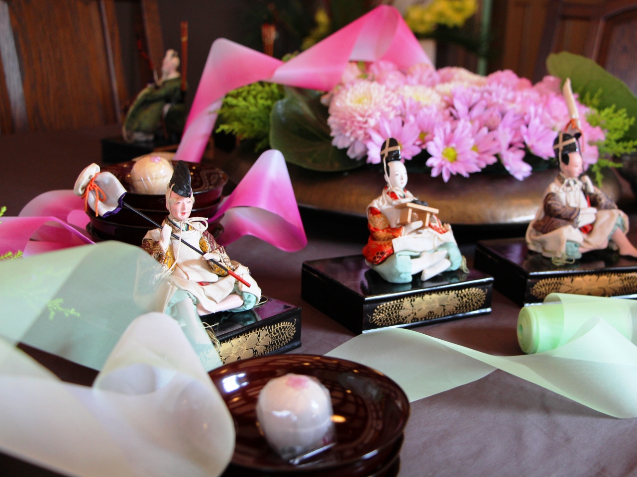 洋館の大きな窓から差し込む春の柔らかい光の中のお雛様たちは、和でありながらも洋館の雰囲気に華を添えています。