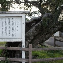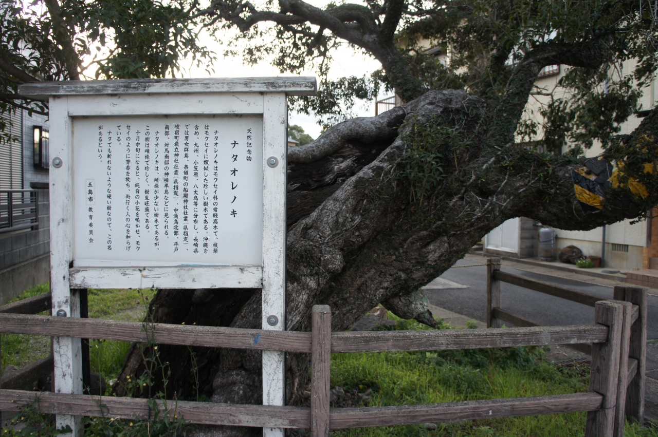 ナタオレノキは、福江の市街。六角井戸に行く途中にありまして、大事そうに白い囲いで守られた天然記念物の大木です。
