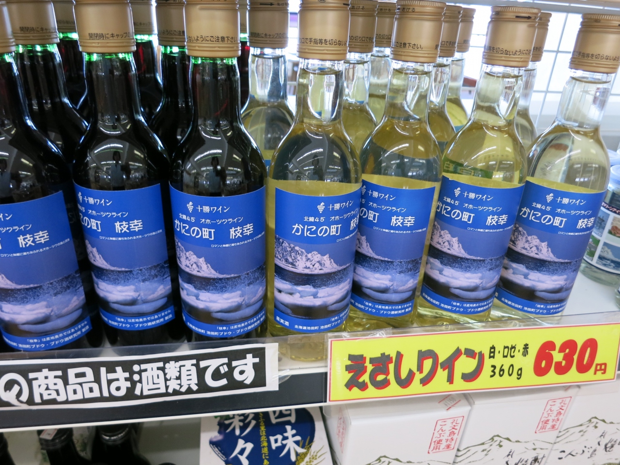 道の駅には、お土産コーナーもあり、枝幸のお土産のほか、稚内や北海道のお土産も置いてあり、訪れた観光バスツアーの人達が買い求めていました。「はまなすクッキー」は、この店オリジナル。蒸しケーキの「かに食べ放題」や、「カニぱい」などは枝幸限定のお土産だそうで、他にも「かに祭りせんべい」や「木いちごジャム」、「しころハチミツ」(「しころ」=キハダの木)、海産物加工品などが売られていました。枝幸で作っている訳ではないようですが、流氷の神威岬のラベルがきれいな「えさしワイン」(赤・白)というのもありました。また、中頓別町の「砂金ようかん」も気になりました。