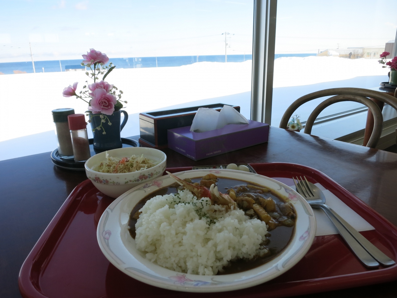 観光バスがいない時は人もまばらで、よく晴れた青空の下、白い雪の向こう見える青いオホーツク海を眺めながらの食事は、カレーの隠れたスパイスとなって、一層その味を引き立たせてくれました。