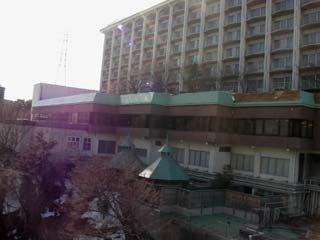 鬼怒川観光ホテルの温泉に入った後、近くにある歩行用のふれあい橋を渡ってみると、鬼怒川の両岸に高層ホテルが建ち並び、さきほど入った鬼怒川観光ホテルの露天風呂も見えます。対岸の階段には鬼怒川温泉のシンボルの「鬼怒太」が描かれています。