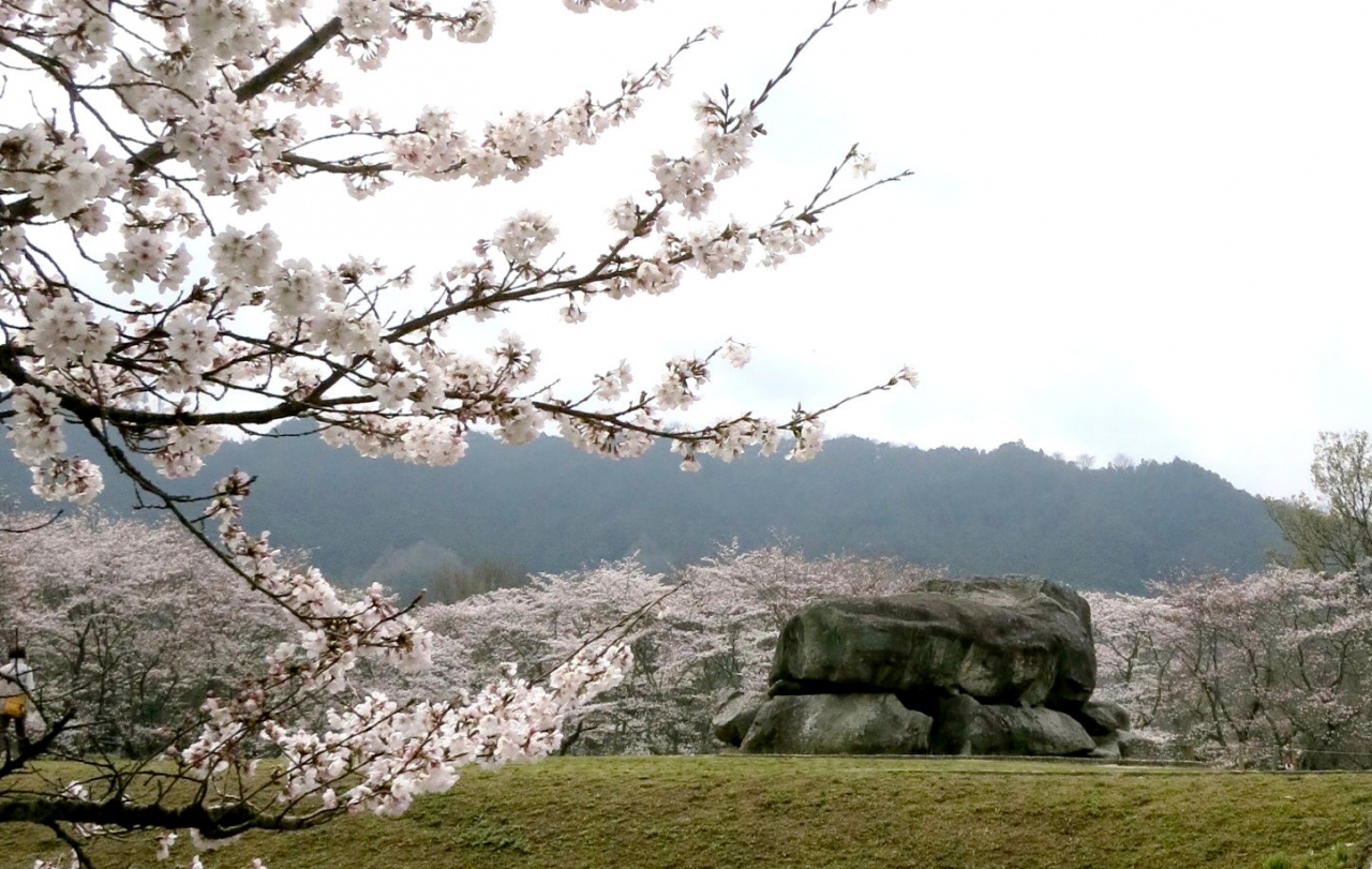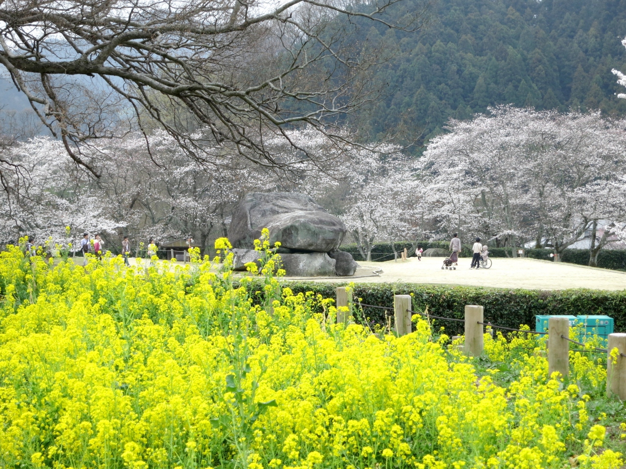 その石舞台全体が見える周辺には、桜と同じく満開を迎えた「菜の花」が咲き、