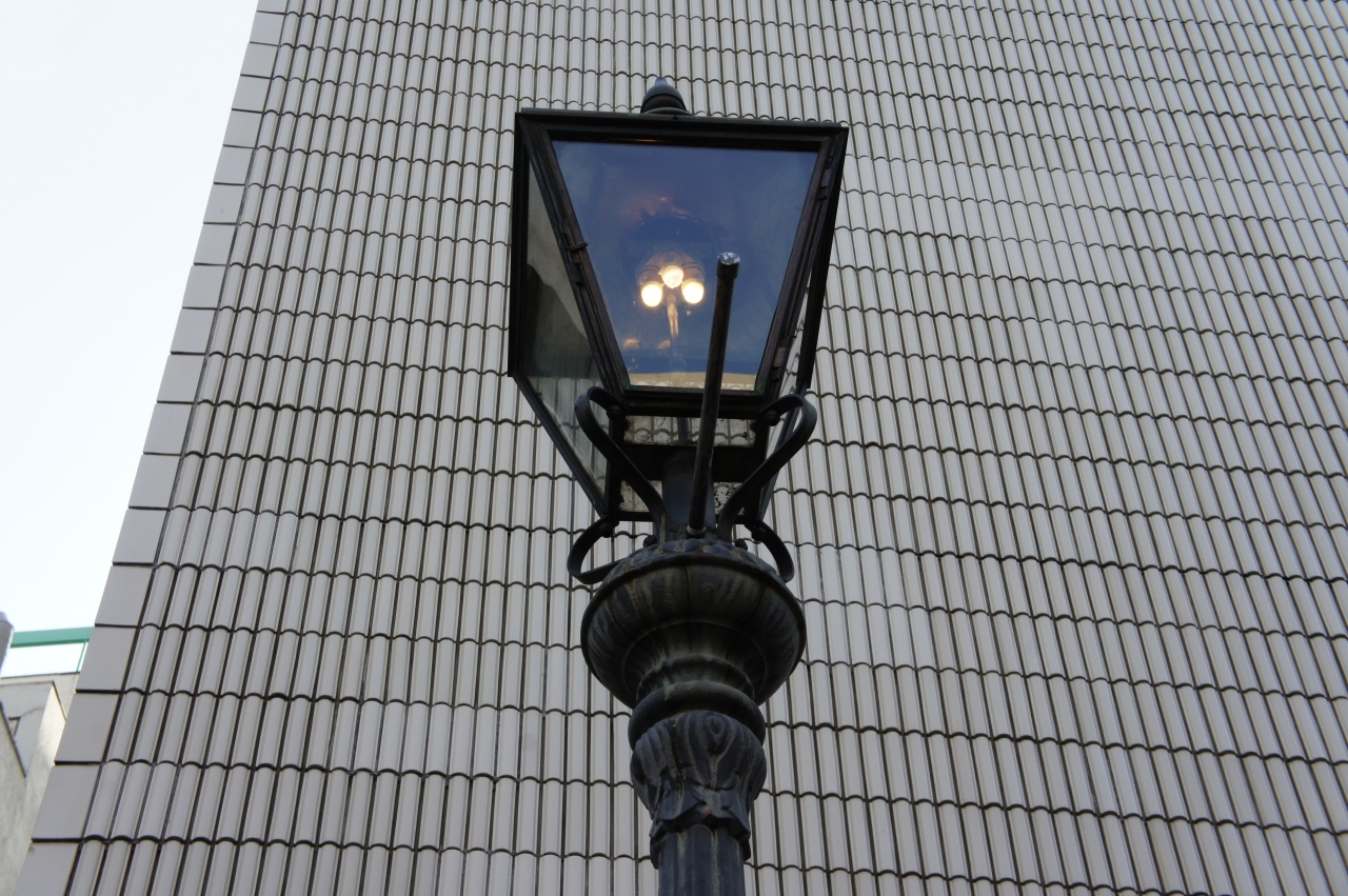 日本で最初のガス灯ですが、馬車道にはほかにも街灯がいくつかあるので、ちょっと見つけにくいかも。馬車道沿い関内ホールの前です。