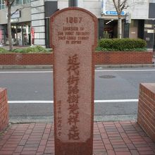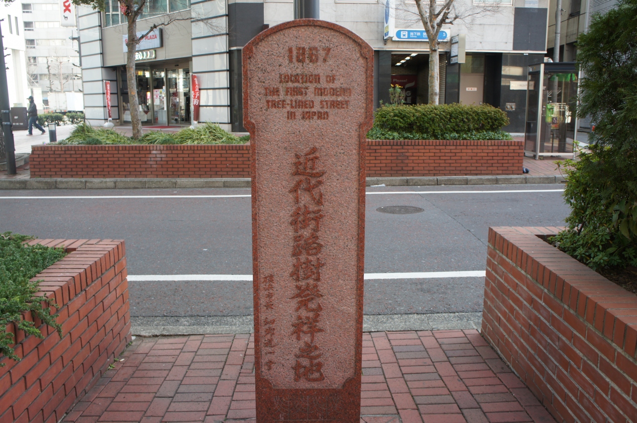 近代街路樹発祥の地は、馬車道でも関内駅側。赤い大理石の碑です。