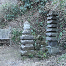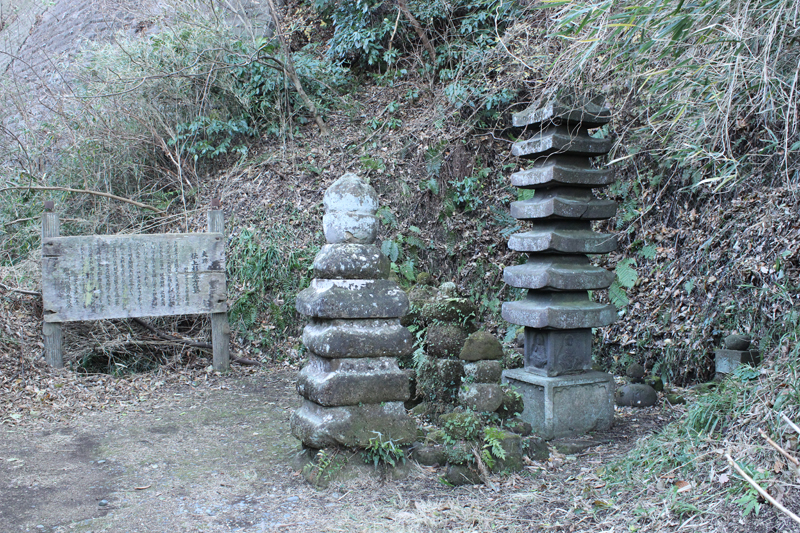 極楽寺切通しの坂の上あたりの道端に、上杉憲方墓と書かれた石がおりますが、そこの細い道を山の方に少し行くと、崖の下に石塔がいくつかあります。一番大きな七層の石塔が、1379年に関東管領となって1394年になくなった上杉憲方の墓として伝わっており、国の指定史跡となっています。