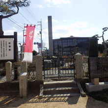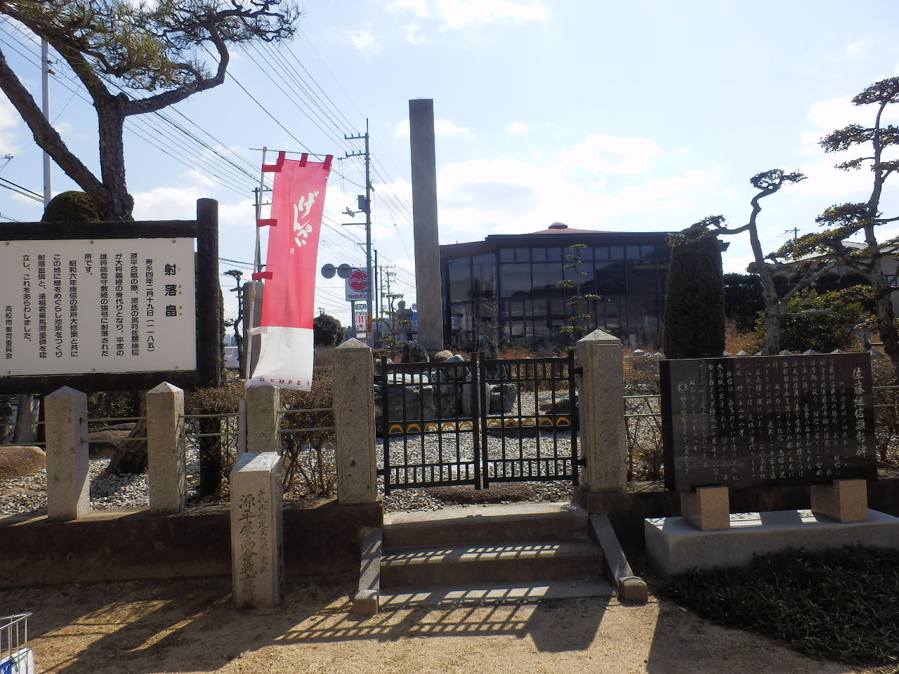 源平屋島合戦の激戦地で、源義経の家臣の佐藤継信が平家の能登守に射抜かれ、馬から落ちて亡くなった場所が射落畠と呼ばれています。八栗駅から徒歩数分、総門跡にも近い場所の車道沿いにあり、大きな石碑が建っていました。