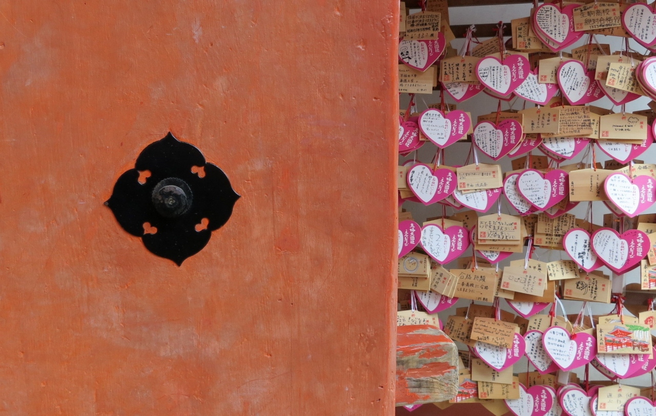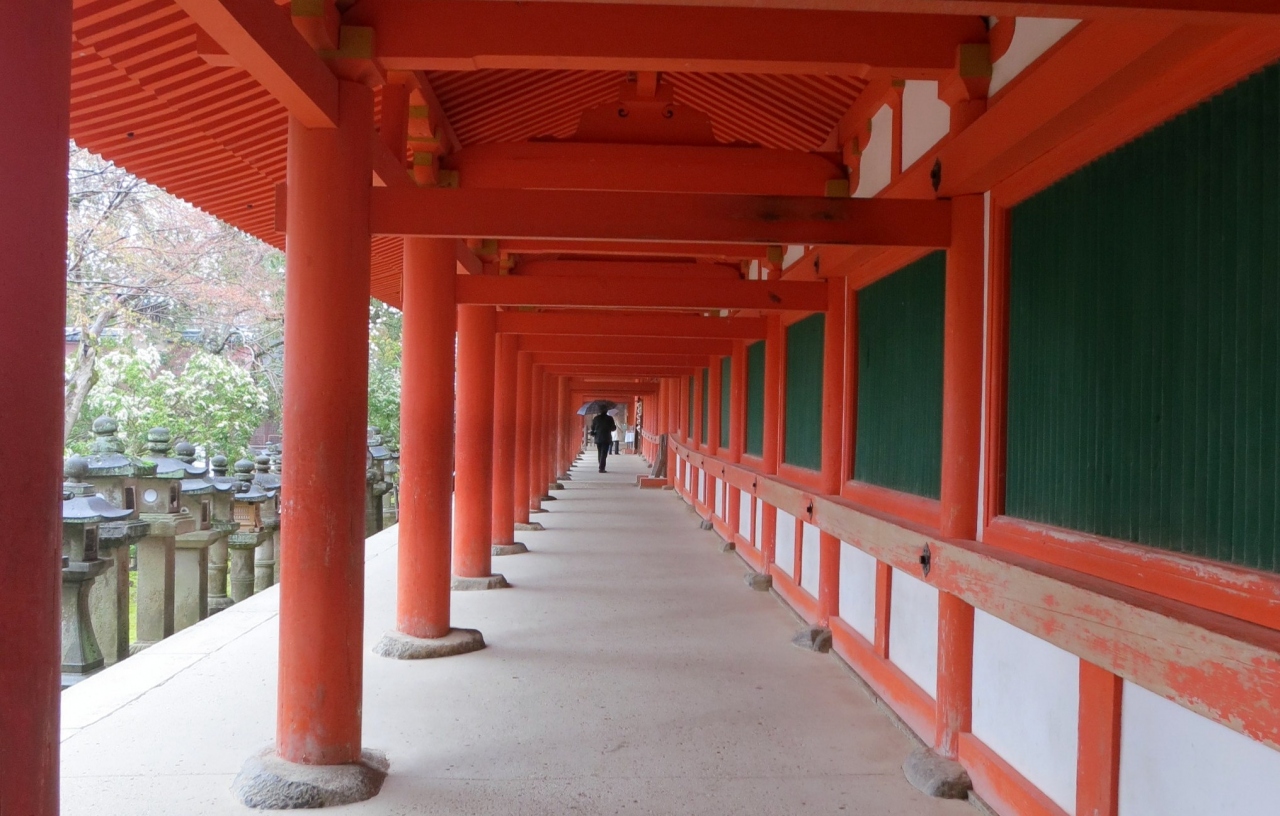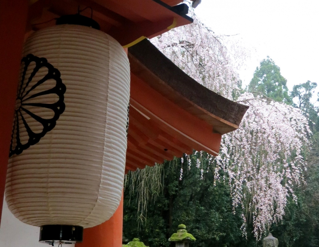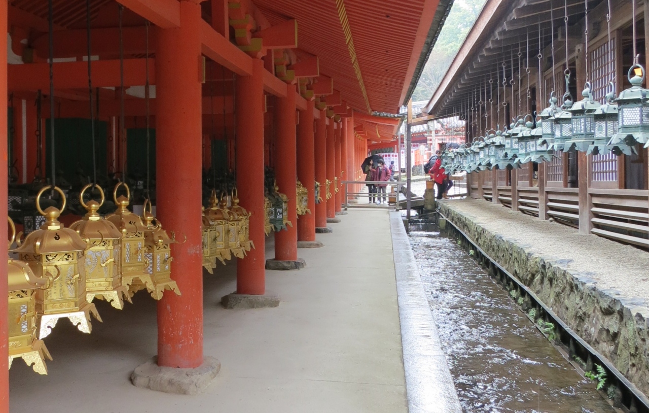 朱塗りの建物と釣り灯篭が見応えある