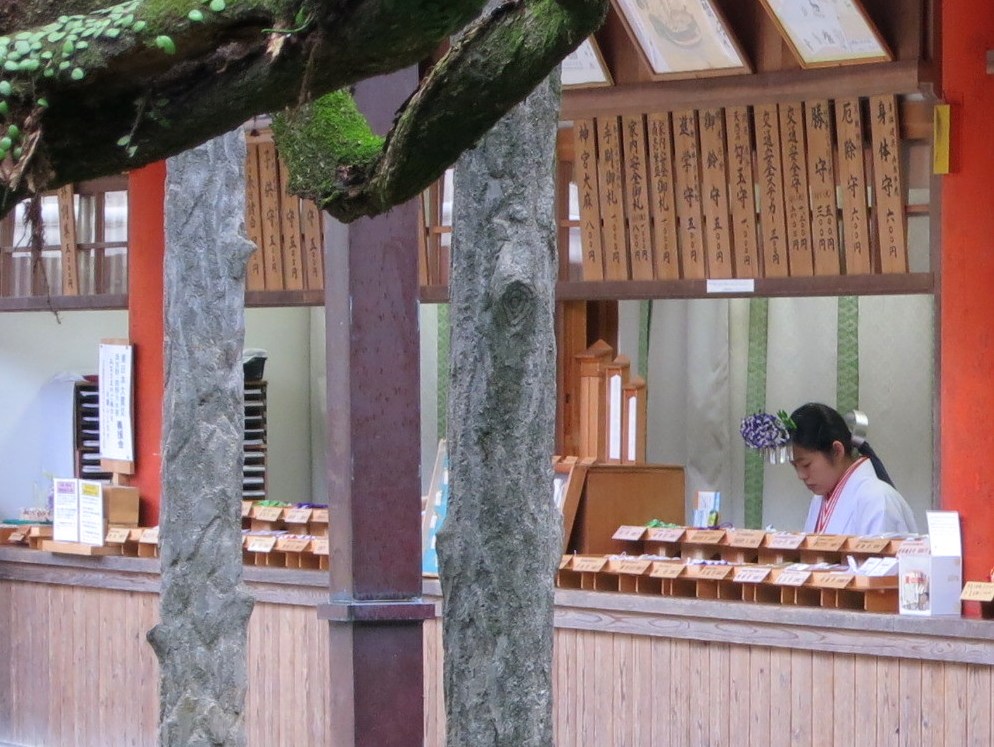 藤の花が「春日大社」のシンボルらしく、売店の女性の頭に藤の花の