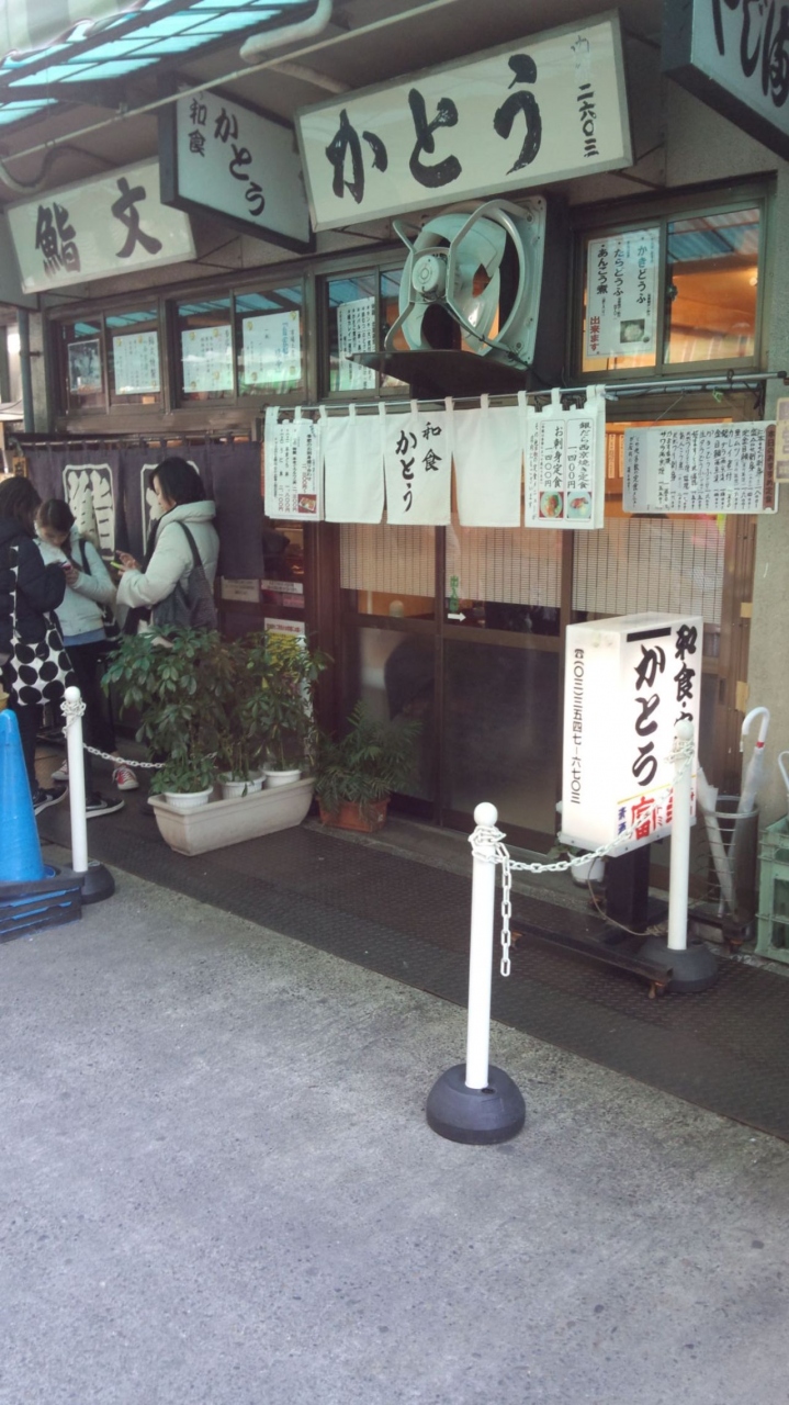 築地場内の飲食店コーナーにある魚料理メインのお店。お寿司屋さんは行列ができますが、こちらは余裕。カウンター席15席。魚は、30種類くらい。表に表示のあった定食から、1400円の銀ダラ西京焼き。10名程度のお客さんの内、3名が銀ダラ定食。人気メニューのよう。銀ダラは脂のっている。西京は、私には甘過ぎ。定食には、お新香、ほうれん草のお浸し、シジミの味噌汁が付く。単品で、1000円以下はなく、ご飯セット450円、ネタで勝負の感じ。