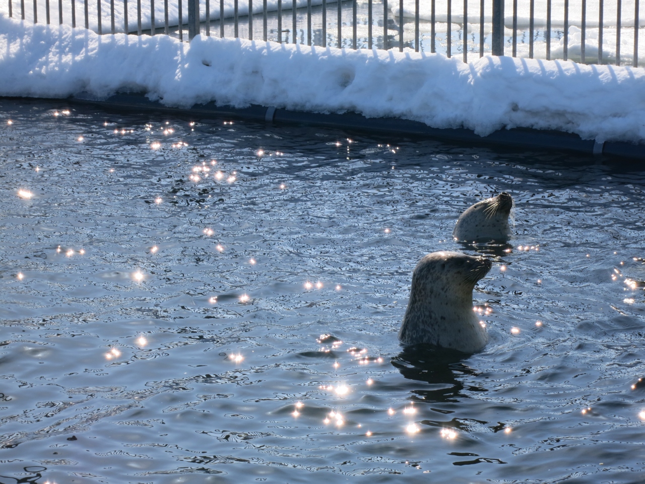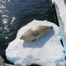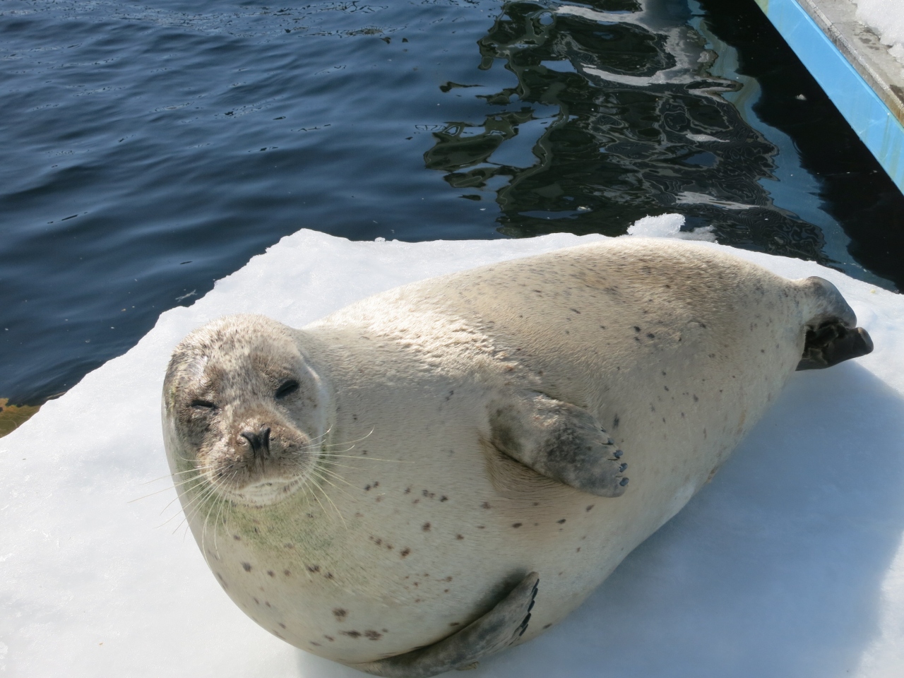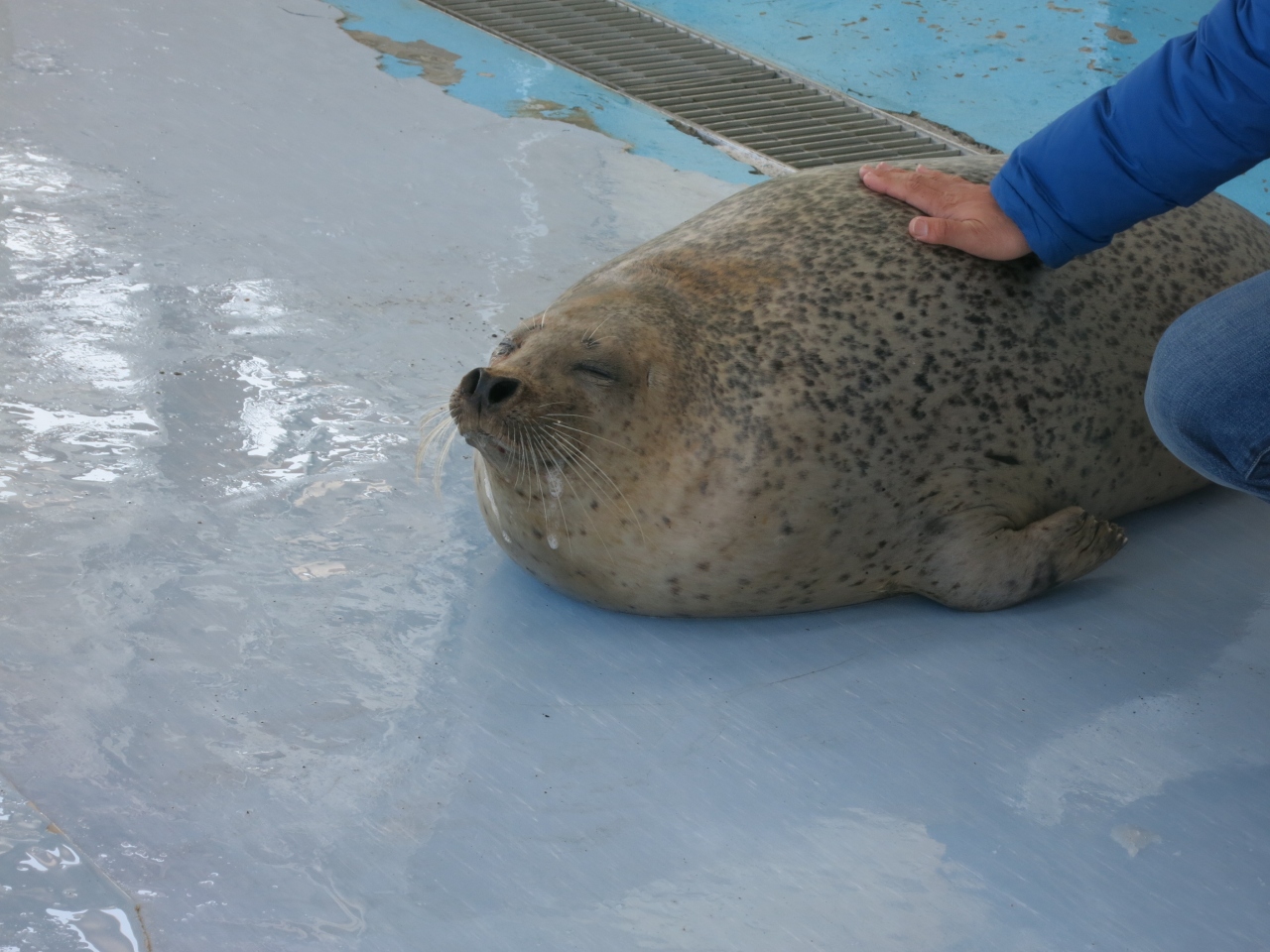 犬みたいに人懐っこく、エサをねだっています。寝転がったり、ポーズをとったりと愛嬌ふりまくり。最後は、飼育員さんの誘導でアザラシに触ることができます。