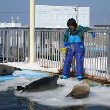 10:30、11:30、13:30、14:30、15:00の時間は餌やりの時間。プールサイドでアザラシを目の前にして、その生態について飼育員さんが解説してくれます。
