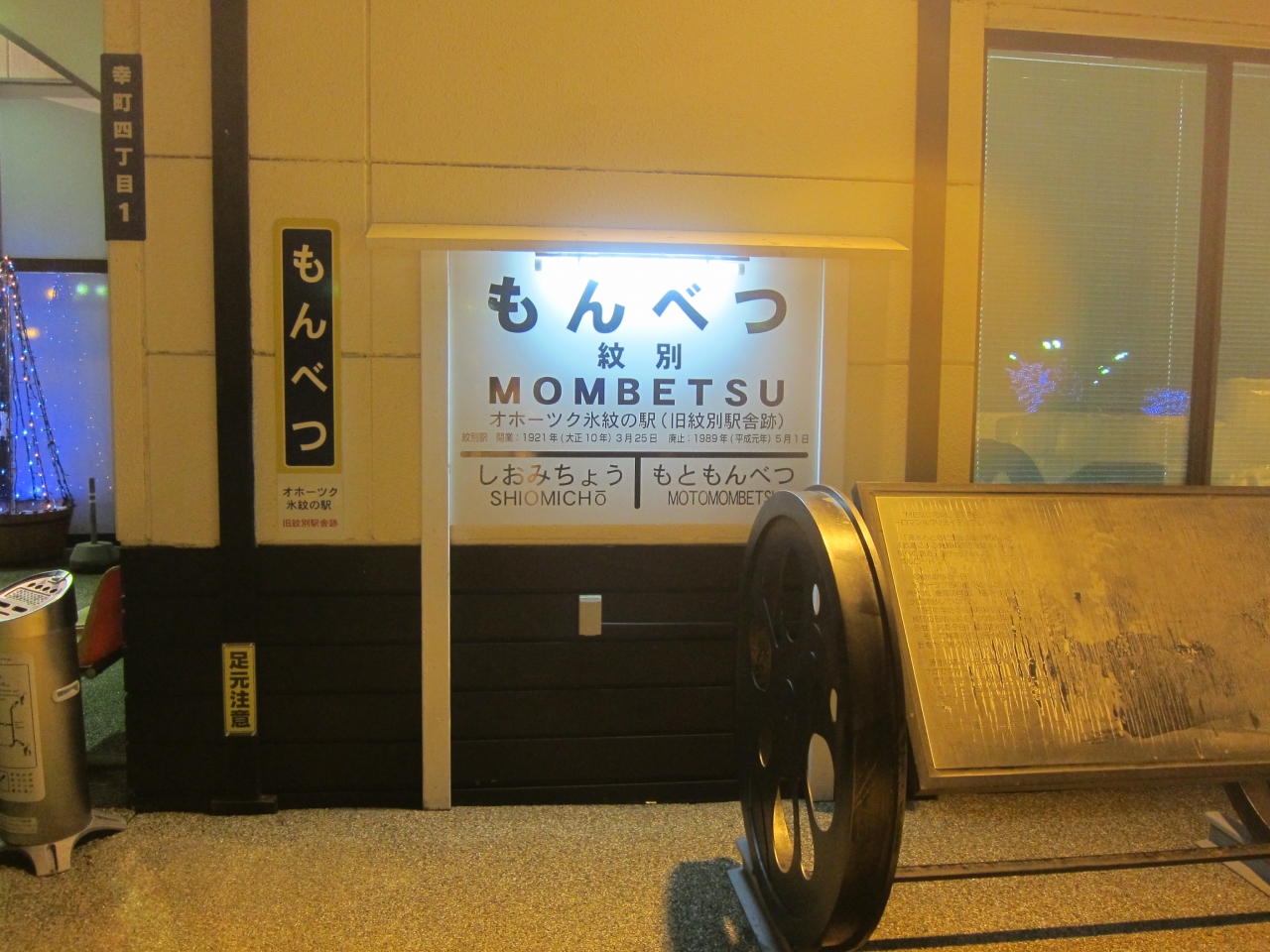 バスターミナルとともに旧名寄本線、紋別駅の跡地に建っており、店の前に紋別駅の駅名板がありました。