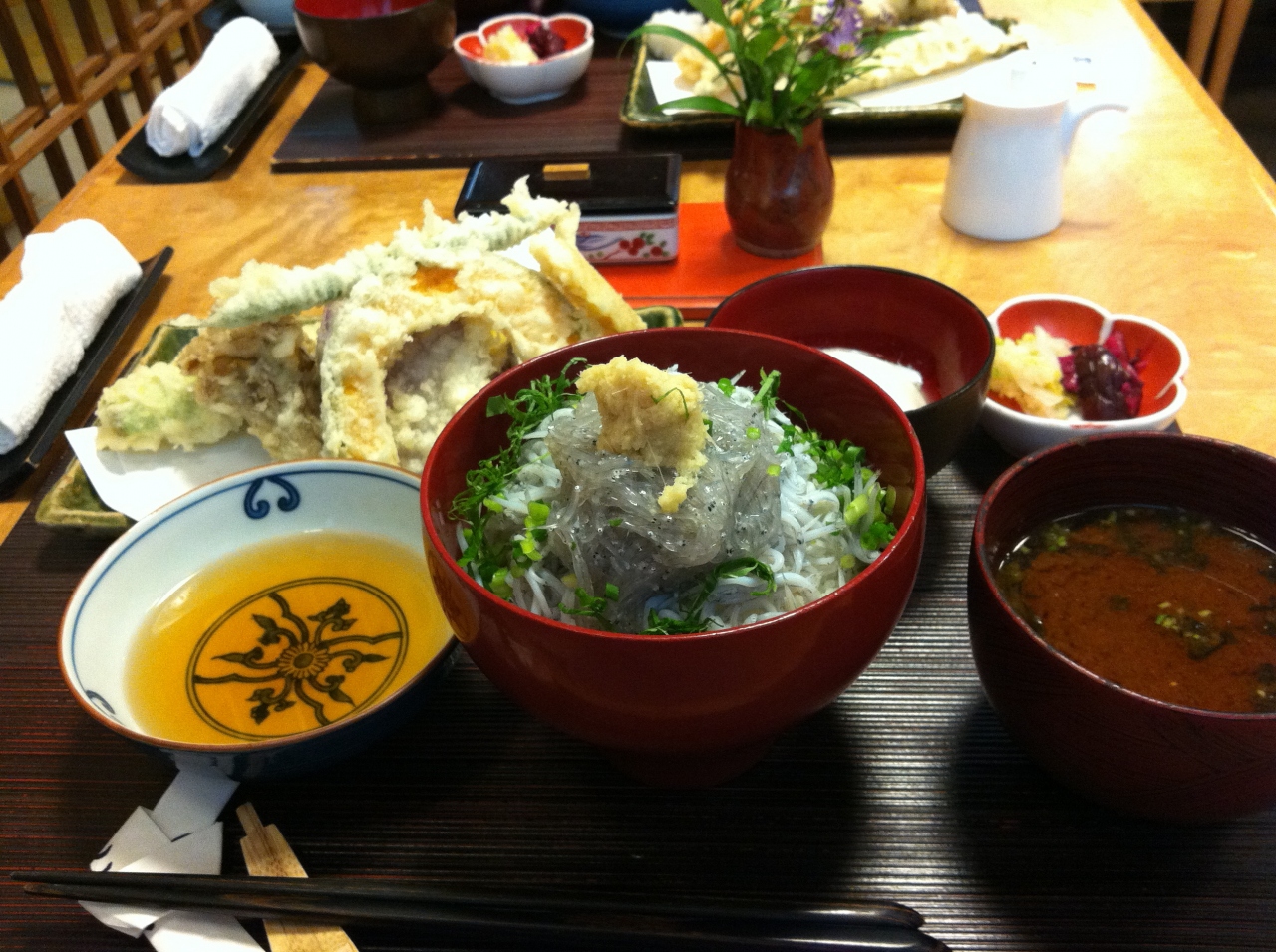生シラス丼と鎌倉野菜の天ぷらに先付やデザート、赤出汁がセットになって2000円程とリーズナブル。