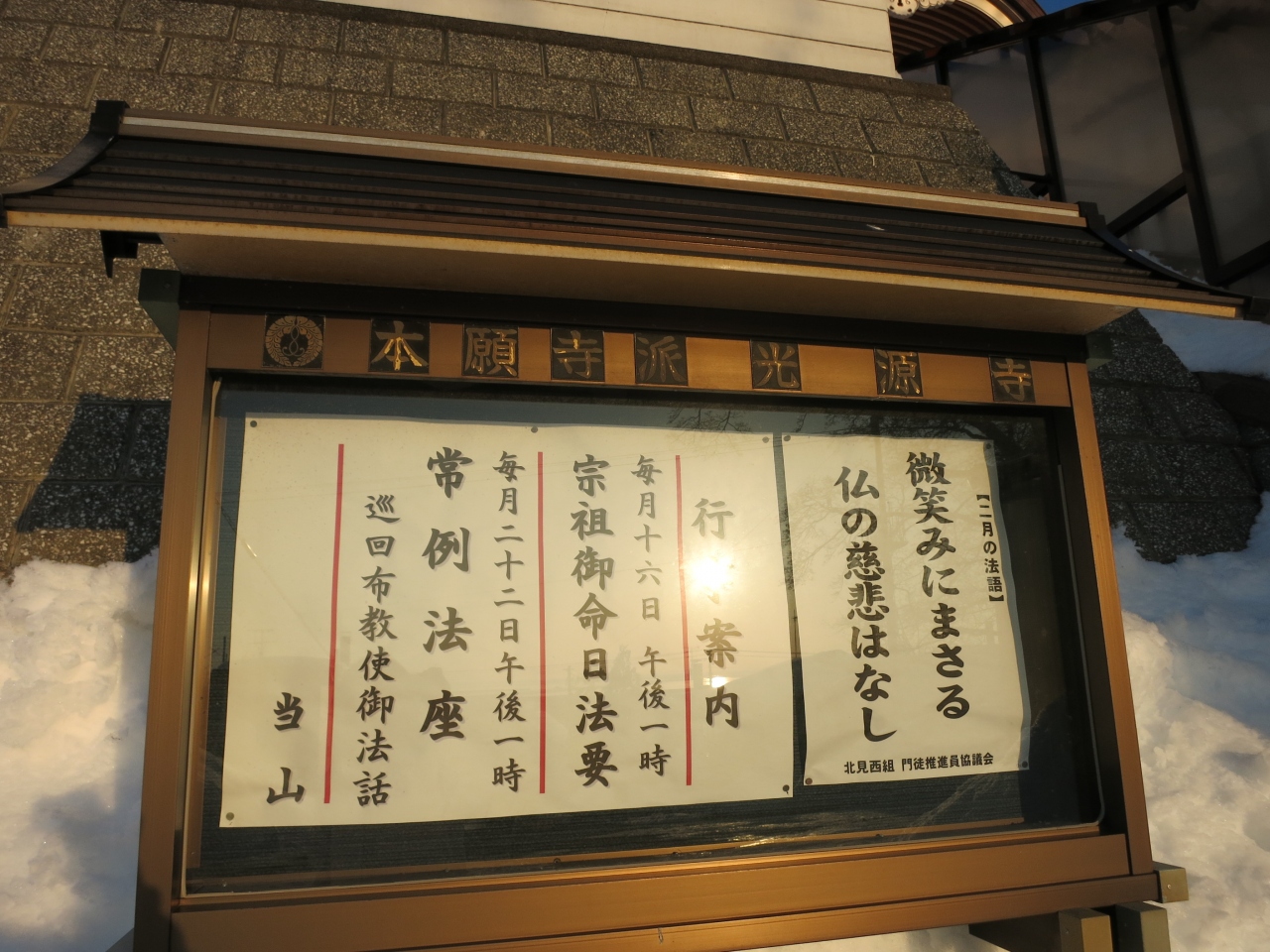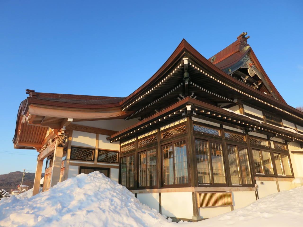 紋別の中心部、紋別バスターミナルや道の駅氷紋の駅の近くにあるお寺で、紋別公園の丘に少し登ったところにあります。
