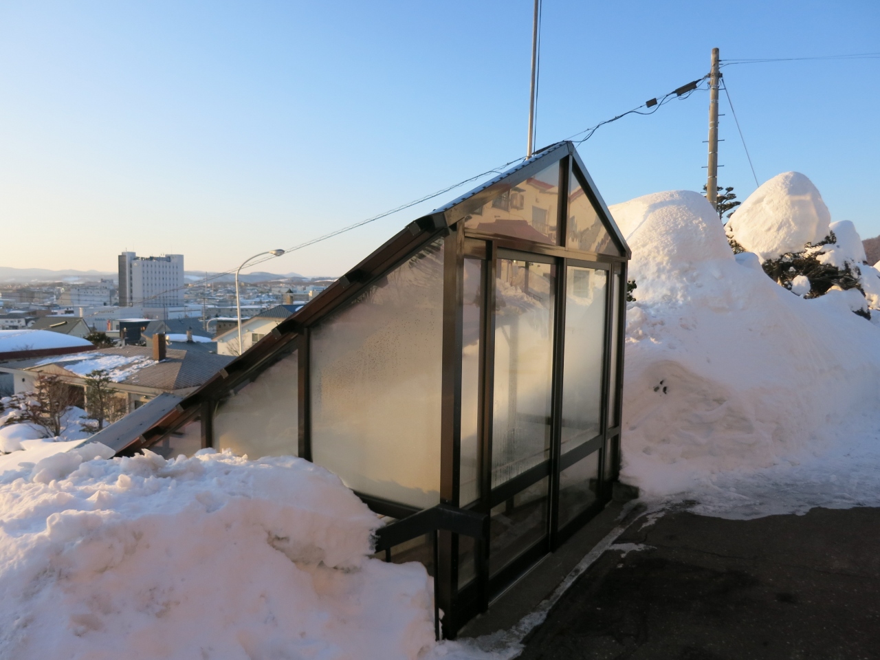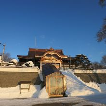 お寺の階段にシェルターが付いていて、雪の積もった冬でも参拝しやすくなっています。