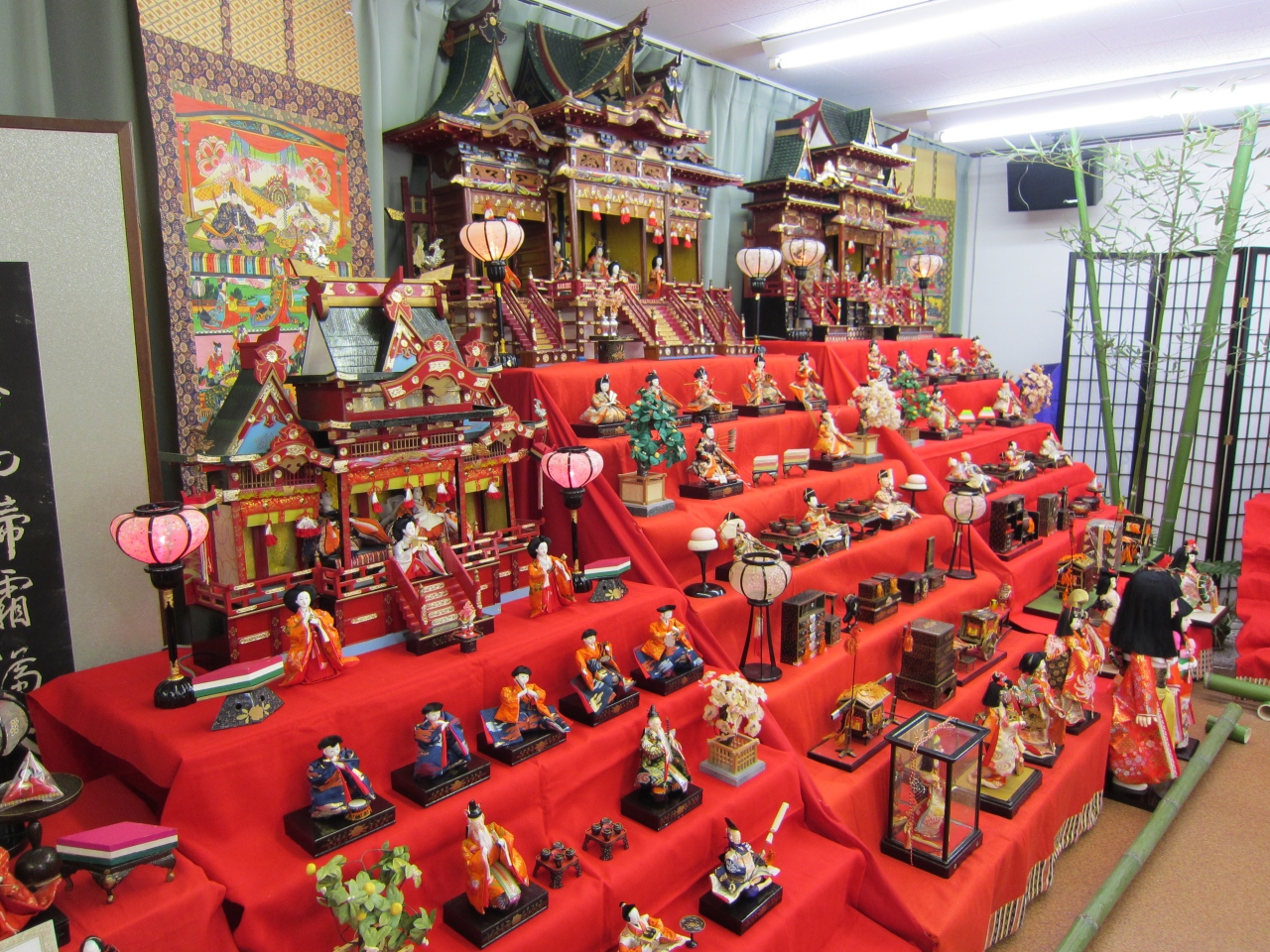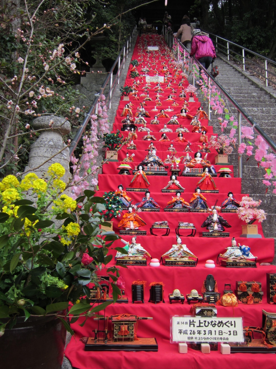 神社の階段に飾られたたくさんの雛人形は、あでやかで素敵でした。