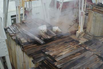 千畳敷からバス通りに戻り、北に向かっていくと温泉の分配施設があり、周囲にはホテルが並んでいて、行幸源泉の矢倉があるところから分かれる狭い道を進むと崎の湯の駐車場があり、満車になるとトランシーバーで連絡して、分岐のところで車を制限しています。
