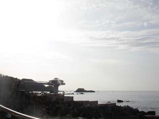 受付で料金400円を払うと、鍵がかかる100円の貴重品ボックスがあり、脱衣場のロッカーは鍵がありません。階段を降りると露天の岩風呂があり、もう一段下にも海に面した岩風呂があり、やや熱めの塩辛い温泉に浸かると、海がよく見えますが、近くの海中展望台からも露天風呂が良く見えそうです。