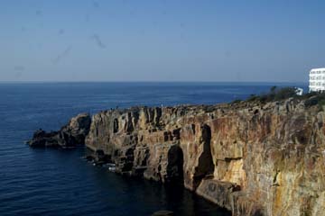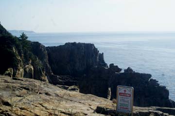 三段壁バス停からみやげ物屋が並んでいる道を下ると三段壁の展望台があり、北側の岩壁の上は平らで歩いていけますが、足がすくむ高さで絶壁の端にはロープがあって、自殺防止の命の電話の番号が書いてあり、福井県の東尋坊を思い出しました。