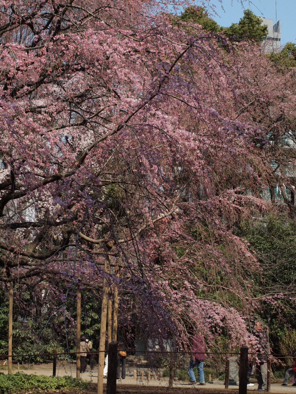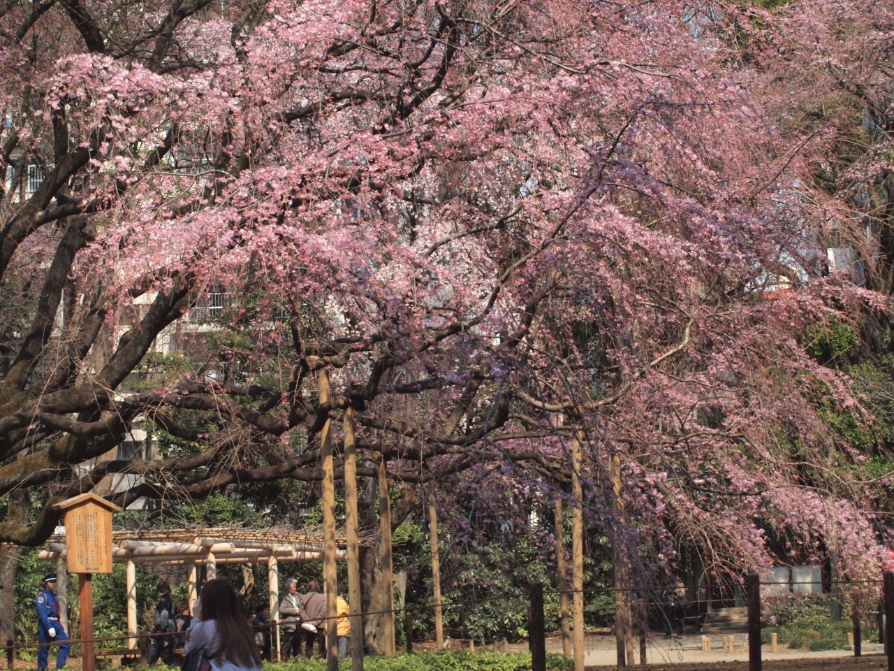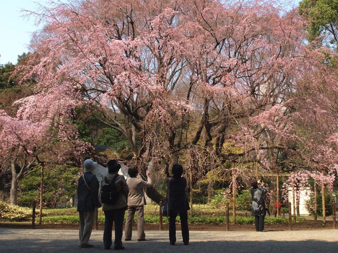 内庭大門をくぐると、六義園のシンボルともいえる大きなしだれ桜があります。この桜は、高さ約15m、幅は約20m。3月末に枝いっぱいの薄紅色の花を咲かせます。流れ落ちる滝を彷彿させるその姿は圧巻です。