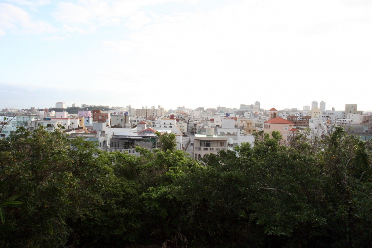 急な階段を上って丘の上を上ると那覇の海と那覇市内を望むことができます。