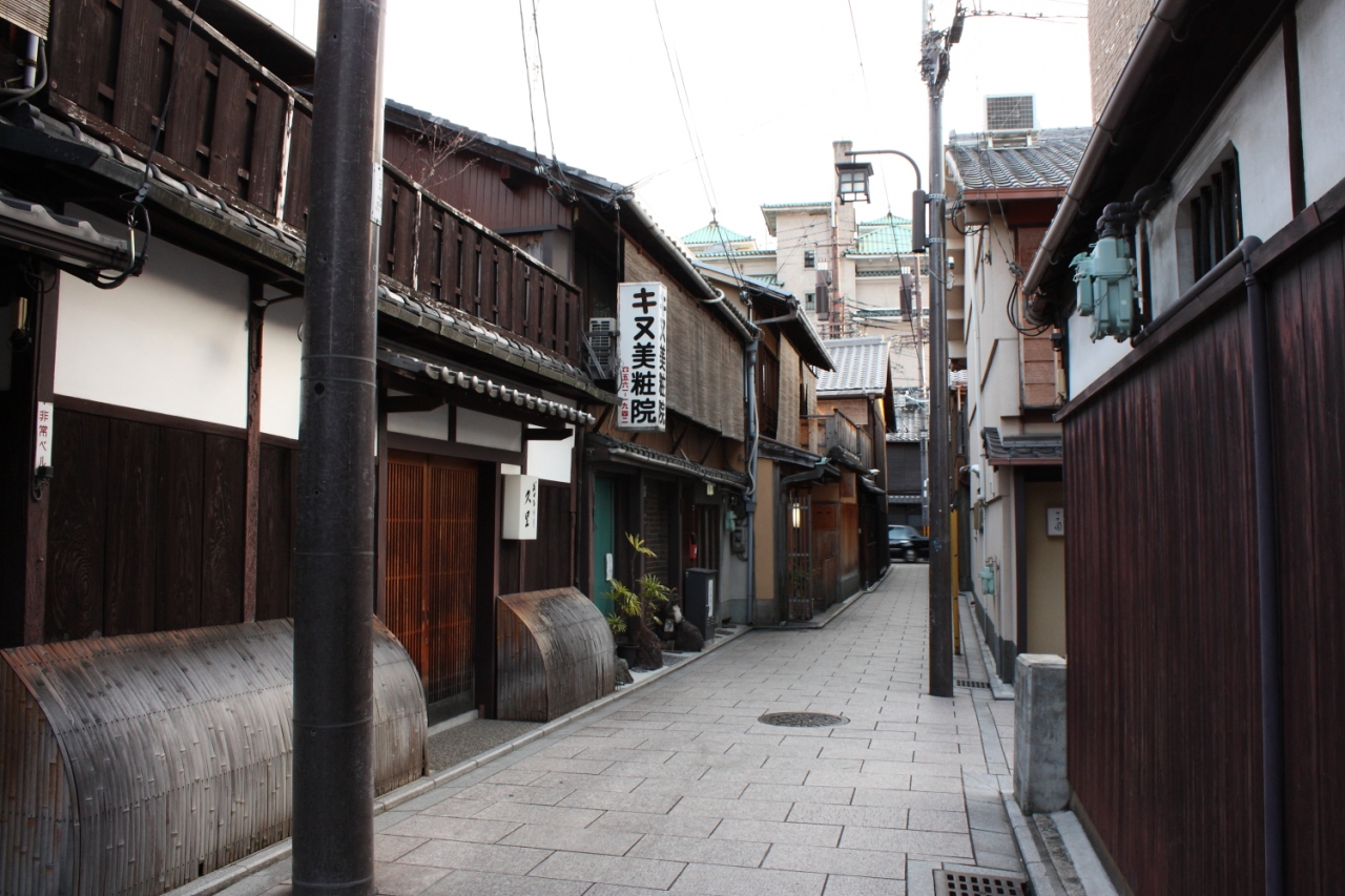 阪急電車四条河原町駅や、京阪電車祇園四条駅から歩いて行けます。近代的で交通量が多い四条通りから角を一つ曲がるだけで、雰囲気はがらりと変わり、石畳に格子窓の趣のある建物が軒を並べています。運が良ければ舞妓さんに会えるそうですが、会えなくても、舞妓さんが歩いて絵になる町並みは十分に楽しめます。