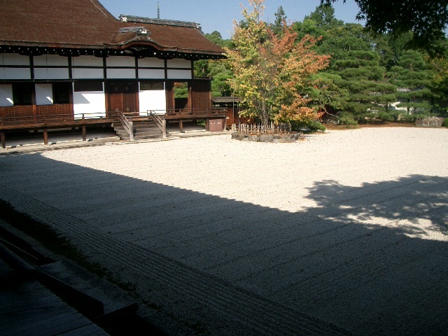 仁和寺御殿の庭園は南と北に分かれています。南庭は、全面に敷かれた白砂が見事です。ただ私が訪れた時は、正面の勅使門が工事中でシートが敷かれていて残念でした。北門にも白砂が敷かれています。こちらは、周りの池や木々とマッチして自然と造形の調和美を感じます。