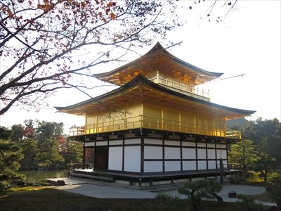 正式には鹿苑寺(ろくおんじ)といいます。二層と三層は、漆(ウルシ)の上から純金の箔が張ってあり、屋根は椹(サワラ)の薄い板を何枚も重ねた柿葺(コケラブキ)との事です